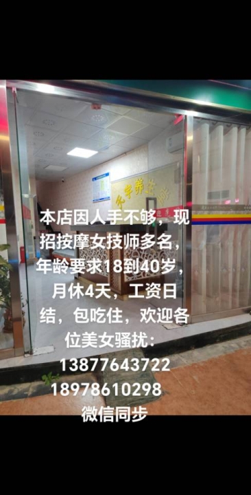 本店招收银员1名,只限女性,年龄18-40岁能接受夜班,分两班倒,工作轻松简单无压力,包吃包住,月休两天,工资面谈,另外招按摩女技师3名,要求年龄18到40岁,身体健康,有意者一本人联系