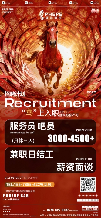 招聘楼面服务员 吧台吧员 月休三天 底薪三千全勤两百多劳多得...