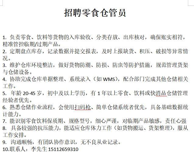 急招零食仓库管理员,主要负责零食仓库收货,上架管理。...